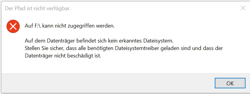 Eine Formatierung habe ich nicht vorgenommen sondern das Fenster über „Abbrechen“ geschlossen. Die nächste Meldung „Auf F:\ kann nicht zugegriffen werden“ (Anlage B_2.jpg). Diese habe ich mit „Ok“ geschlossen.