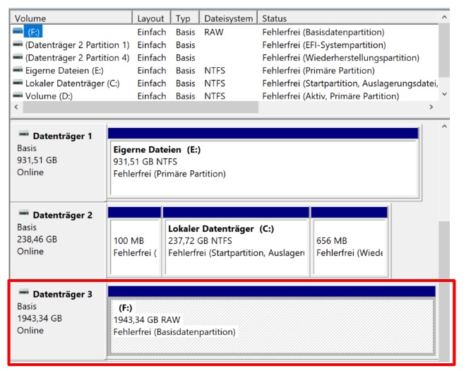 Über die „Systemsteuerung/Computerverwaltung/Datenspeicher/Datenträgerverwaltung“ (Anlage B_3.jpg) wird die Festplatte als Laufwerk „F:“ angezeigt mit dem vermerke „RAW“
