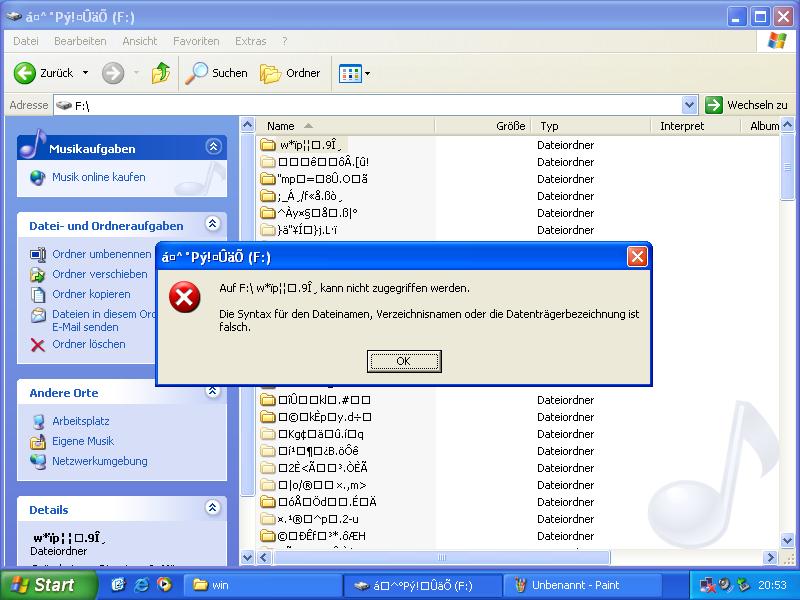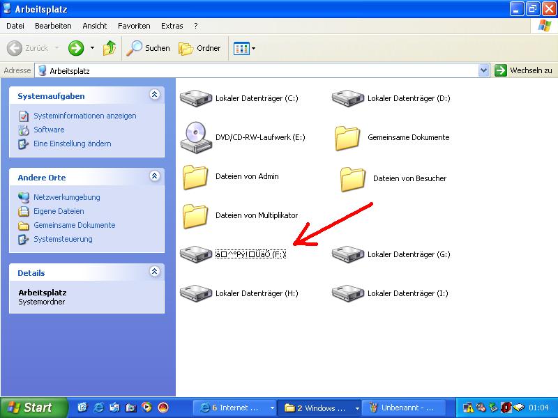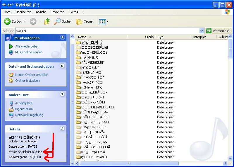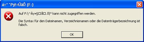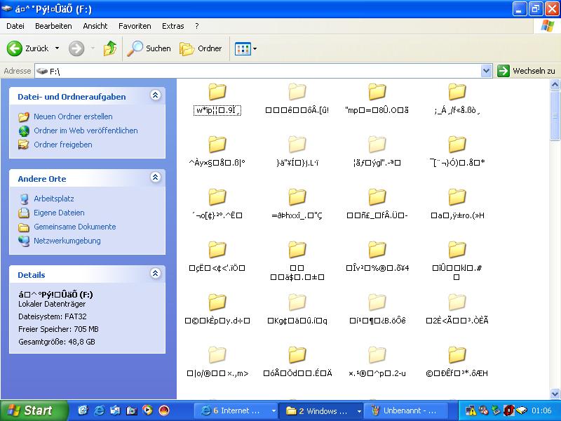 Laufwerk "F", "G", "H" und "I" sind die Laufwerkspartitionen einer 200 GB Festplatte, wobei die Partition "F" ein Wirrwar anzeigt, was vorher nicht war. Wenn ich auf das Laufwerk "F" zugreife, werden mir die Ordner wie auf Bild 2 zu sehen ist, ebenfalls ein Zeichensalat angezeigt. Links sehe ich aber die gesamte Festplattengröße von 48,8 GB, davon sind noch 805 GB frei. Ich gehe davon aus, dass hier noch was zu retten ist.