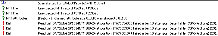 habe pc inspector auch schon mal schauen lassen, gibt leider endlos nt-read-errors deshalb hab ich es dann abgebrochen. physikalisch scheint sie aber ok (sagen zumindest seatools und mein ohr
