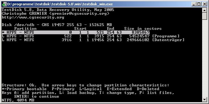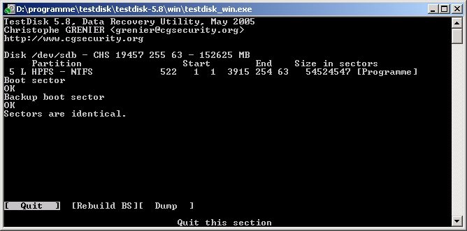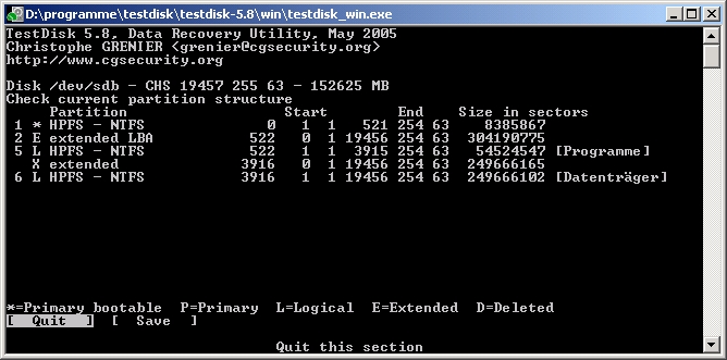 habe dann dieses forum gefunden und mal testdisk (5.8) laufen lassen und siehe da: testdisk sieht die partition, sogar mit dem eigentlichen namen (programme), zeigt aber auch fehler an (screenshots kommen unten, wenn welche fehlen bitte laut schreien!). waren sogar noch mehr read-errors, aber die anzeige hat sich zwischendurch mehrfach erneuert.