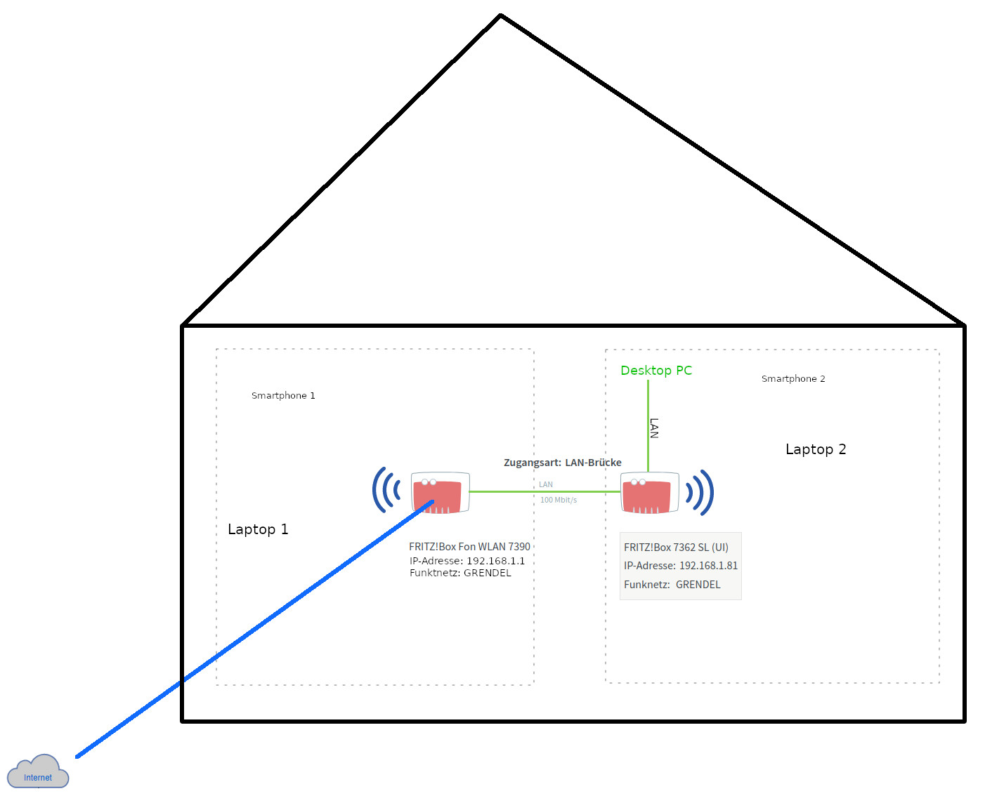 Die Geräte Laptop 1 und 2, Smartphone 1 und 2 sind die selben Geräte nur in einem andern Teil des Hauses.