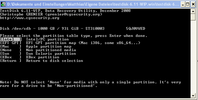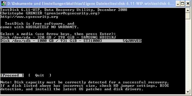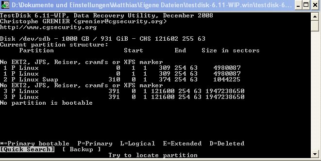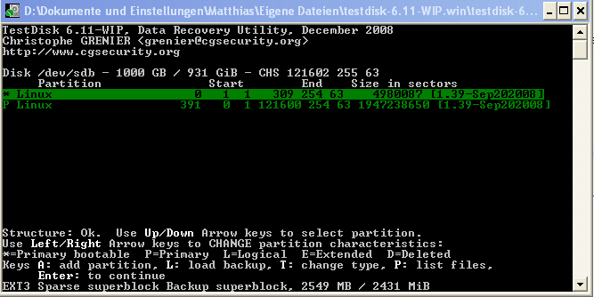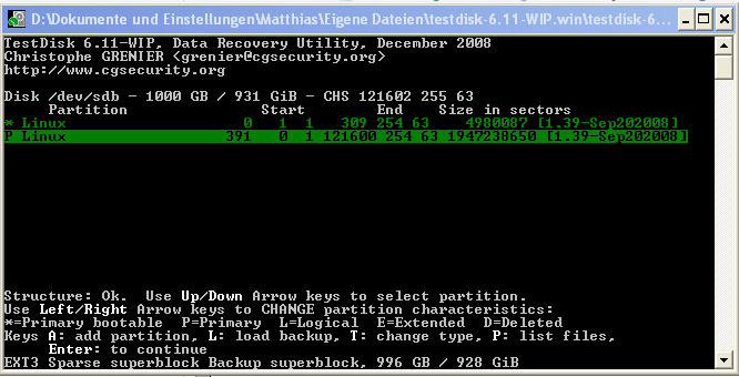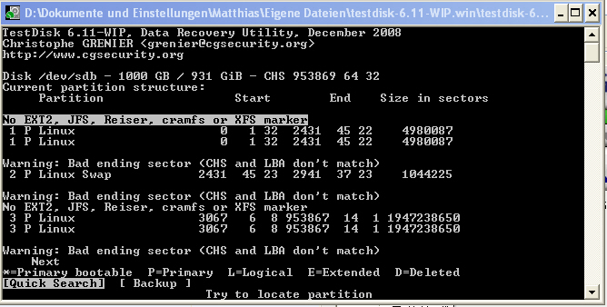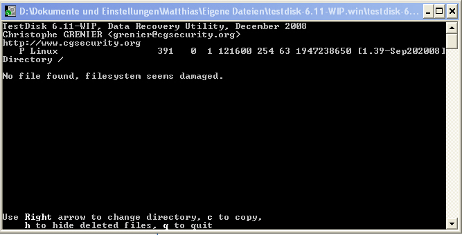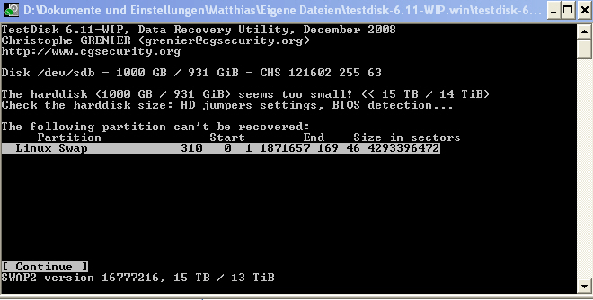 5. Testdisk ausprobiert. Nach Analyse bekam ich die Meldung "the harddisk seems to small"