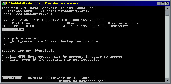 Bild4 und Bild 5: Testdisk Advanced Menu