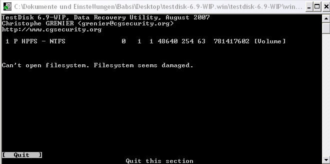 Hab auch mal bissel mit Testdisk 6.4 experimentiert, aber da klappt auch nix (siehe Bilder).