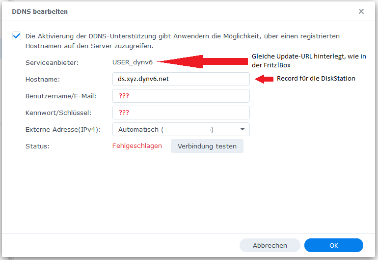 Der Test für die DDNS-Verbindung in der Syno schlägt leider fehl. Im Screenshot siehst du, wie ich das eintrage. Dort habe ich auch die Zugangsdaten aus den Instructions in dynv6 eingetragen. Jedoch schlägt das auch fehl. Welche Daten kommen hier rein?