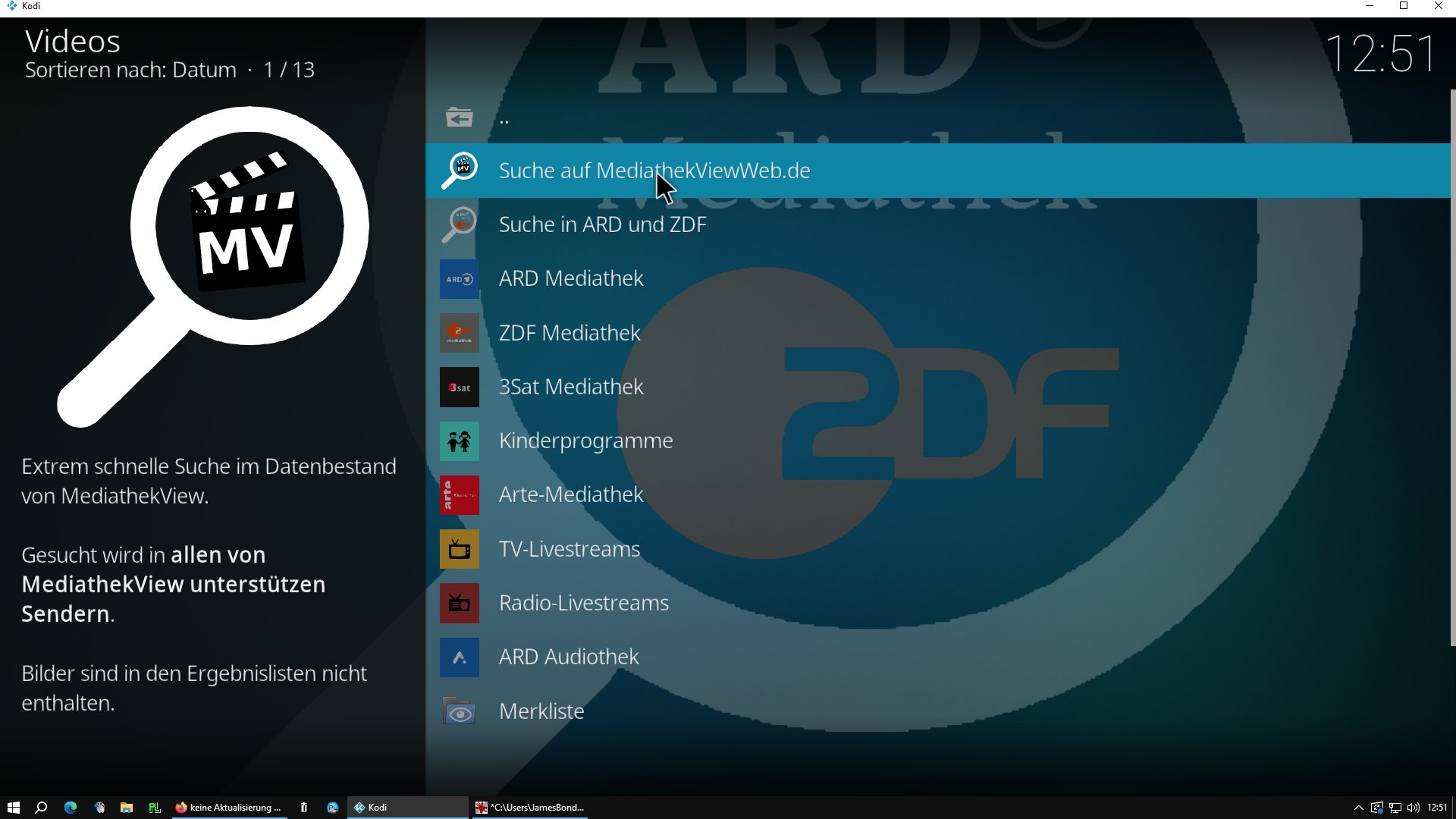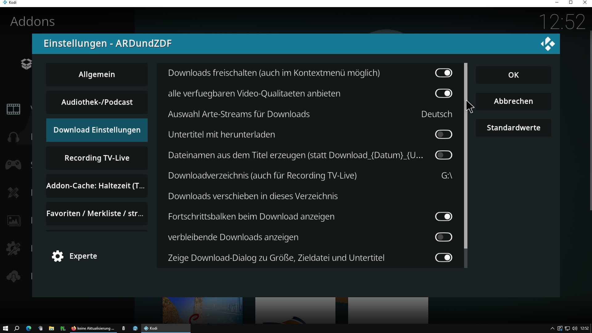 Danke, für die Info. Ich werde mal nachschauen, ob es unter Kodi bei der ARD/ZDF-App von "rols1" auch so ist. Am Wochenende klappte das Filme-runterladen noch ganz wunderbar. Habe erst am Sonntag über die App von "rols1" den Film "Léon - Der Profi" in 1080p runterladen können, und zwar über die integrierte Suche von "Mediathekweb.de". Bei den herkömmlichen Mediatheken von ARD und ZDF bräuchte man nämlich allein schon jeweils ein Konto, um dort Filme ab 16 Jahren überhaupt sehen zu können. Und ich habe es einfach satt, quasi jeden meine persönlichen Daten zu "schenken".