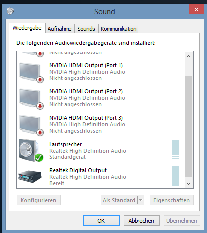 Das Problem ist folgendes, ich habe hier einmal einen Monitor über DVI und einen TV über HDMI angeschlossen, wenn jetzt beide Karten verbaut habe und die Bildschirme an Karte 1 also oben angeschlossen habe, kann ich keine Audiübertragungn über HDMI wählen, auch wenn ich nur die obere Karte Eingebaut habe, ist es genauso, im Soundauswahlmenü steht dort nur, dass nichts angeschlossen ist. Bild kommt aber und kann auch drauf übertragen, das haut alles hin.