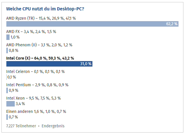 Bei der Statistik sind bei den "Ryzen (TR)" Nennung aber auch die der ersten Generation (Ryzen 1xxx) mit drin. Die wären aber nach aktuellem Stand auch betroffen. Man müsste also von den 62,2% die Zen1-Nutzer abziehen, um die den Anteil der nicht Betroffenen zu haben.