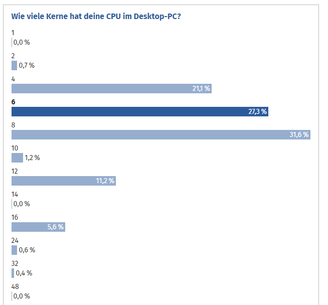 So gut wie alle CPUs mit mehr als 4 Kernen haben auf der Intel Seite eine CPU der 8ten Generation oder höher, die wenigen Ryzen 1600-1800 machen den Braten nicht wirklich fett. Der Anteil an Geräten mit einer nicht unterstützten CPU, dürfte bei den Foristen um die 10% liegen. Zumindest wenn es um das statistisch erfasste primäre Gerät geht.
