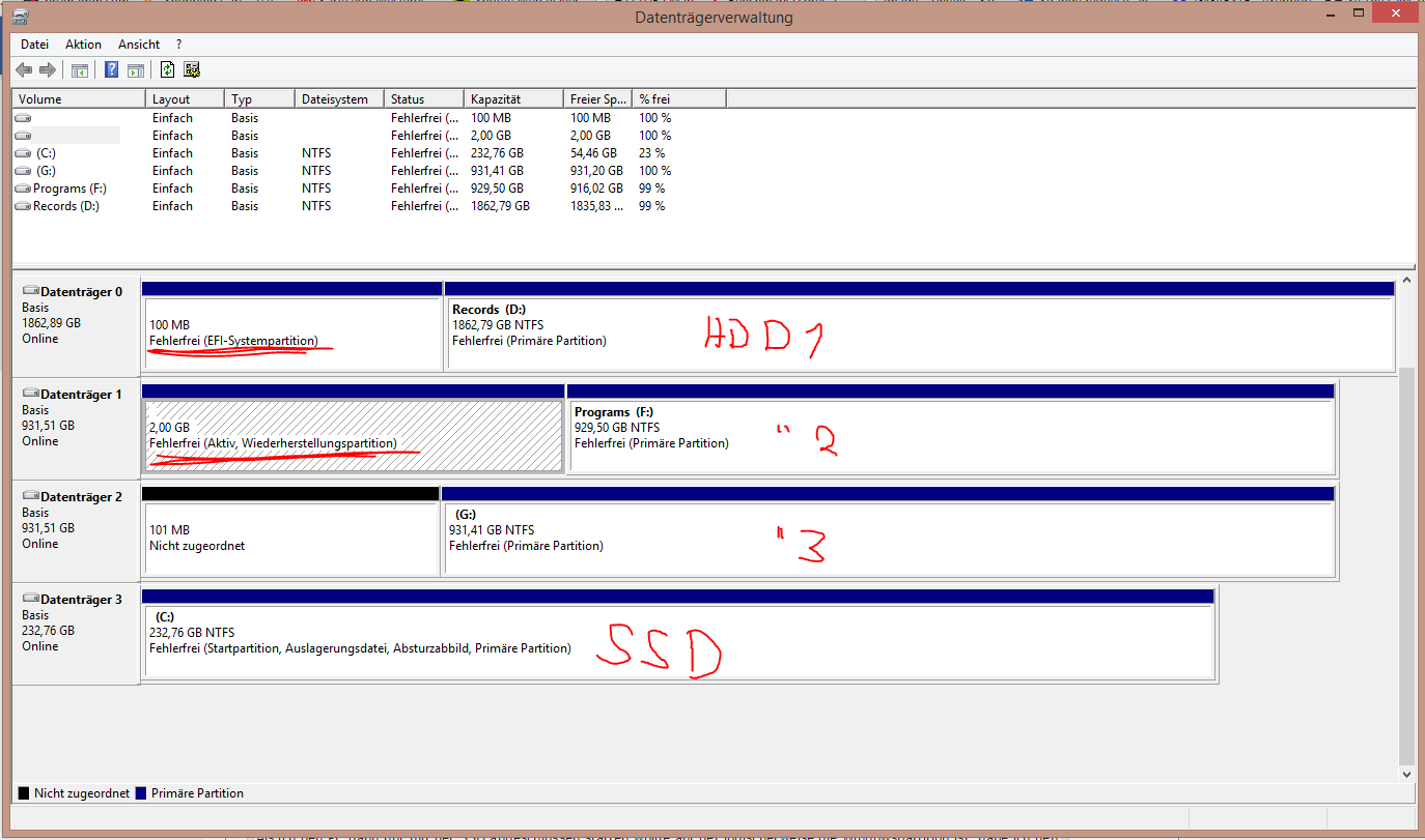 Eine Sache ist mir aufgefallen, nämlich wie in diesem Screenshot zusehen, hat die HDD1 komischerweise eine Systempartition und die HDD2 eine Wiederherstellungspartition. Aber außer diesen 2 Sachen ist mir nichts aufgefallen was zu besagtem Fehler führen kann. Vielleicht weiß jemand von euch ja besser bescheid.
