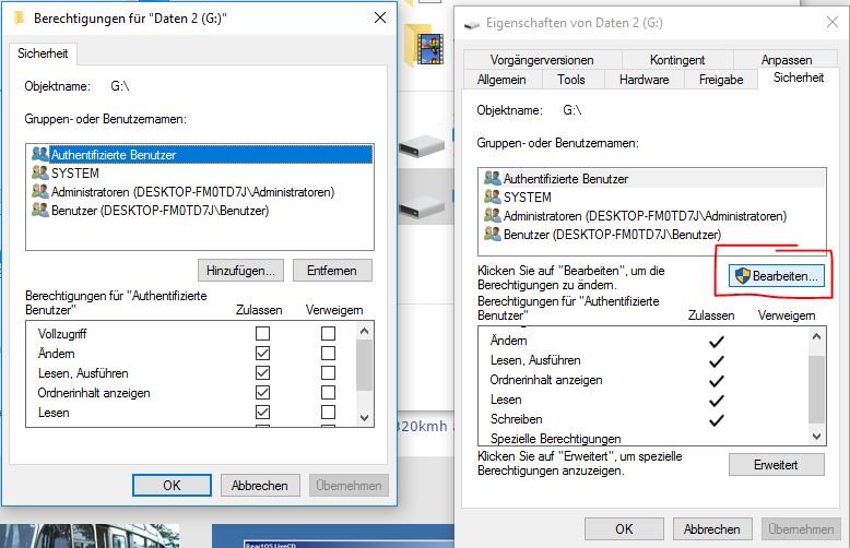 Auf Laufwerk D muss die Gruppe "Authentifizierte Benutzer" alle Rechte außer Vollzugriff und Spezielle Berechtigungen haben.