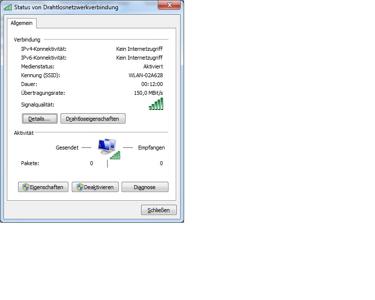 Wenn ich die Details der verbindung aufrufe, sehe ich bei IP v6 sowie IPv4 "keine Internetverbindung"