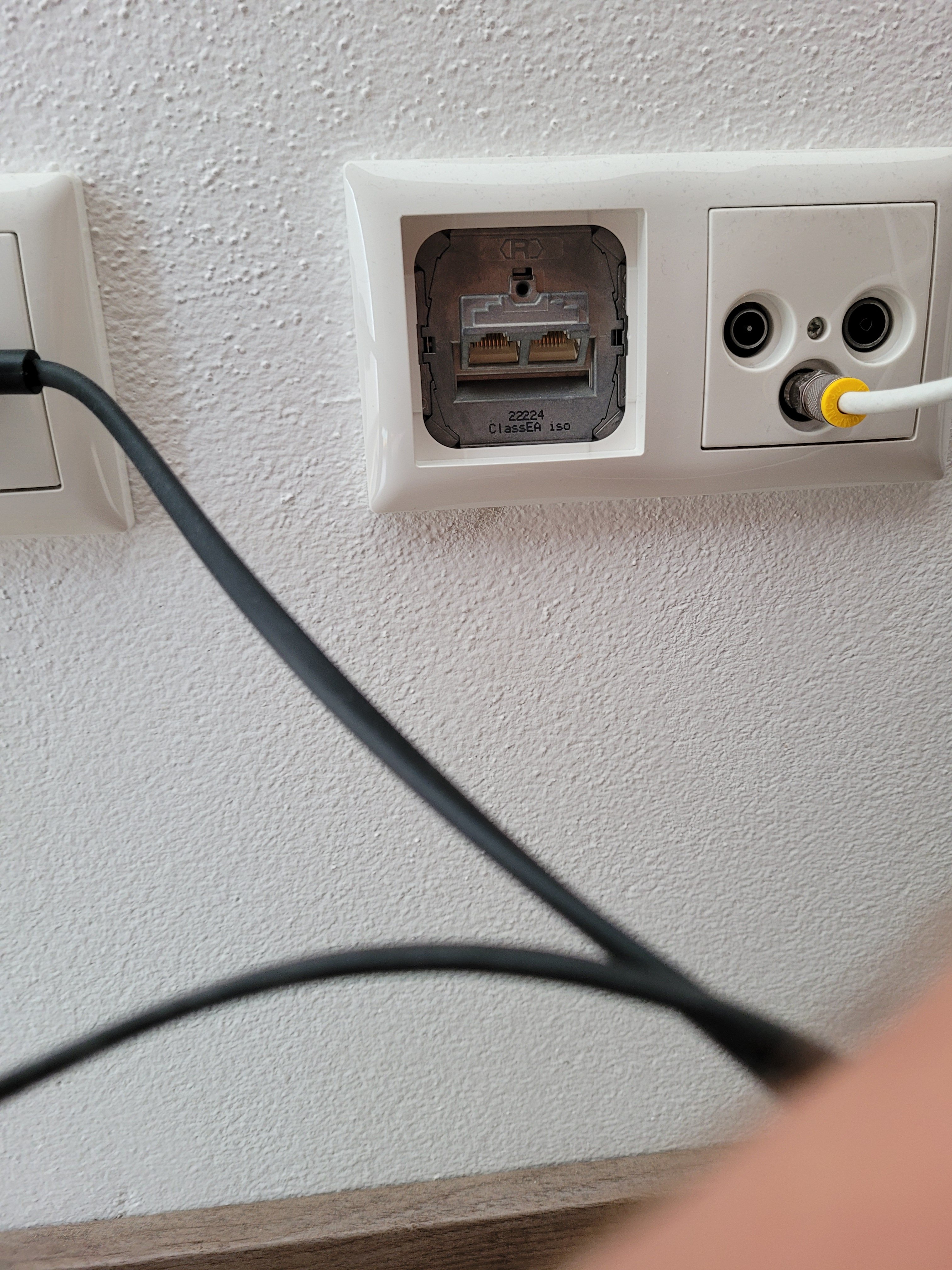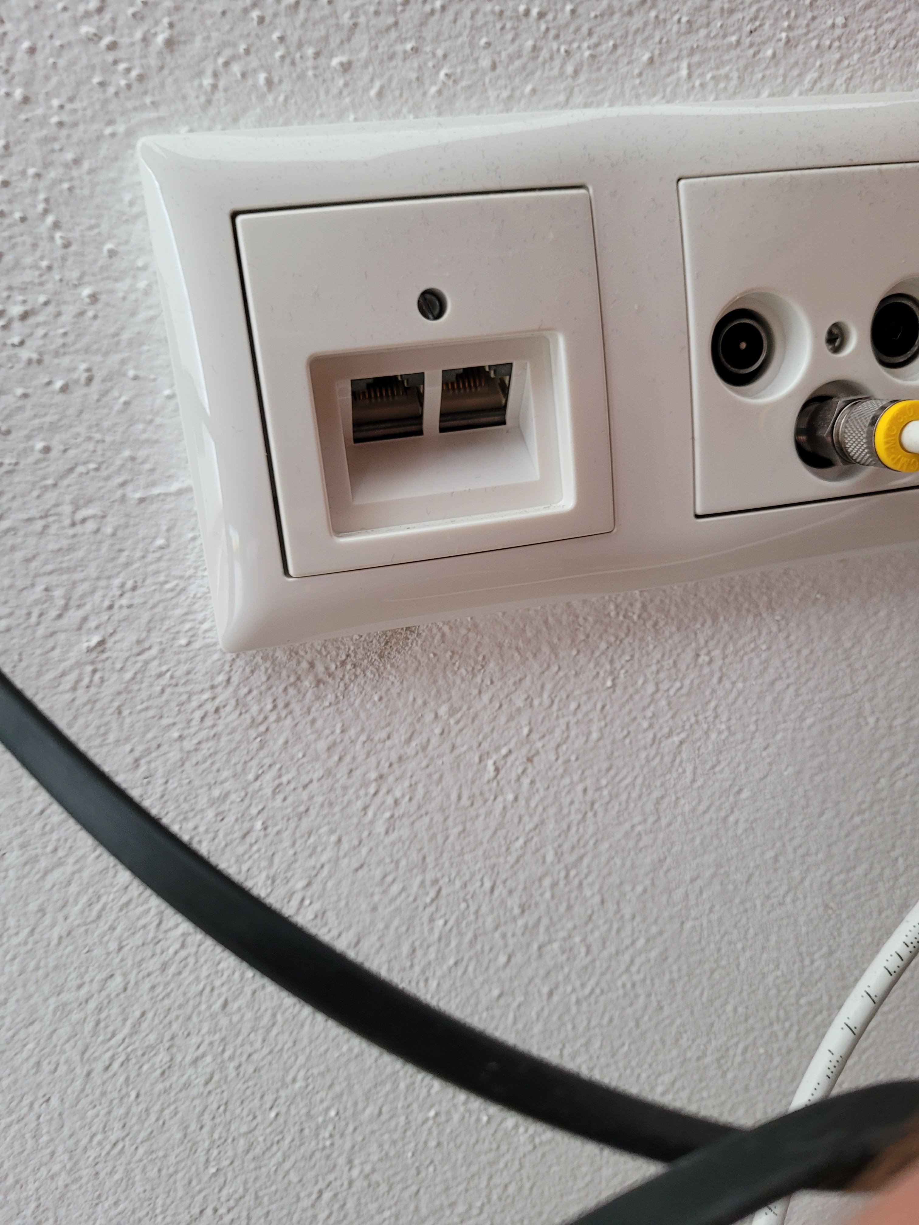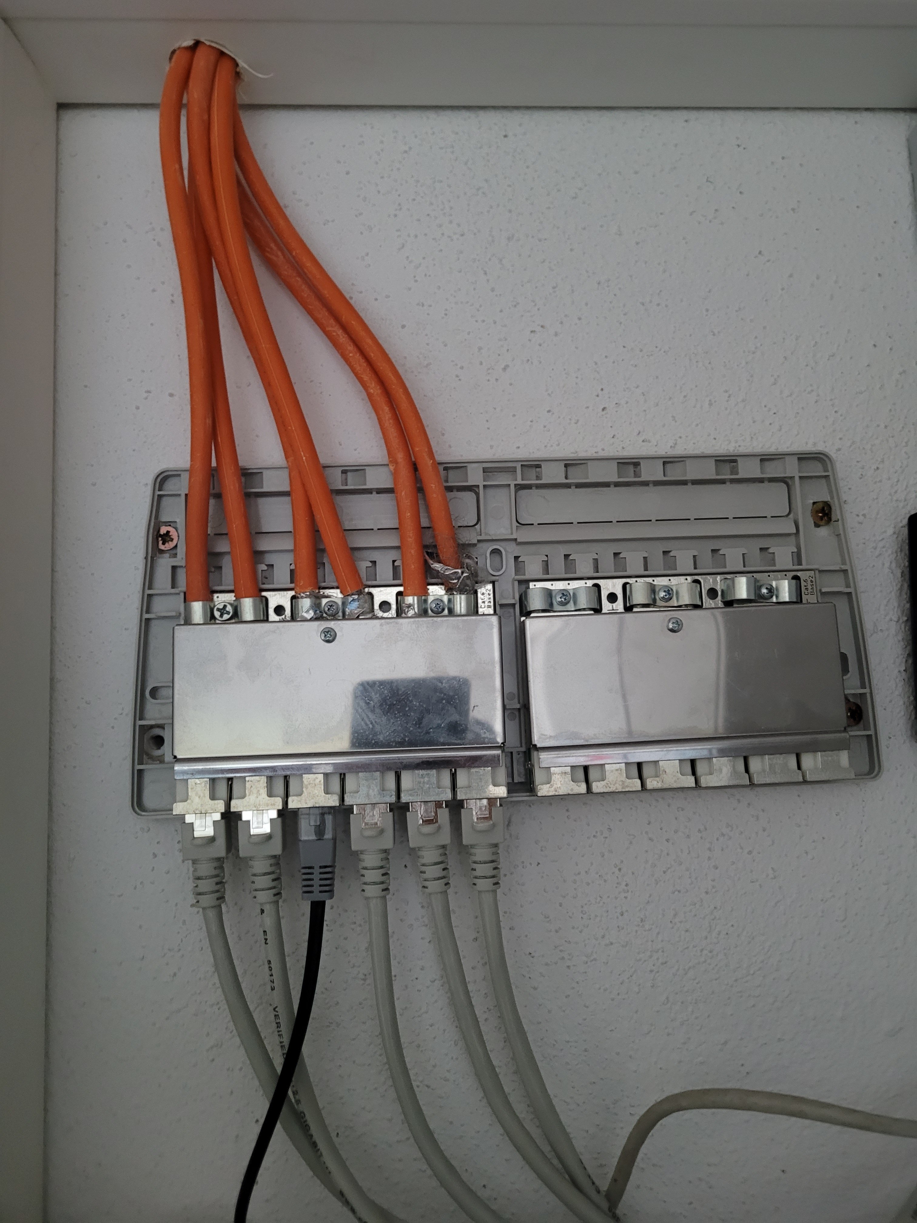 Dann stellt das ganze Patch-Panel (= Telegärtner) keinen Uplink-Port zur Verfügung und der Switch (= D-Link) ist erstmal nicht die Baustelle. Also konzentrieren wir uns auf die Verkabelung zwischen Router (= Speedport) und Patch-Panel: Auf einem der Bilder vom Speedport ist am LAN2 ein Ethernet-Kabel. Laut Deinem ersten Post führt LAN2 auf eine LAN-Dose an der Wand zurück. Wir bräuchten ein Foto dieser LAN-Dose, geschlossen. Und idealerweise ein weiteres Foto aufgeschraubt. Wenn Du aufschraubst, vorsichtig, nicht das Tapete abgeht (ansonsten mit Teppich-Messer die Tapete trennen.