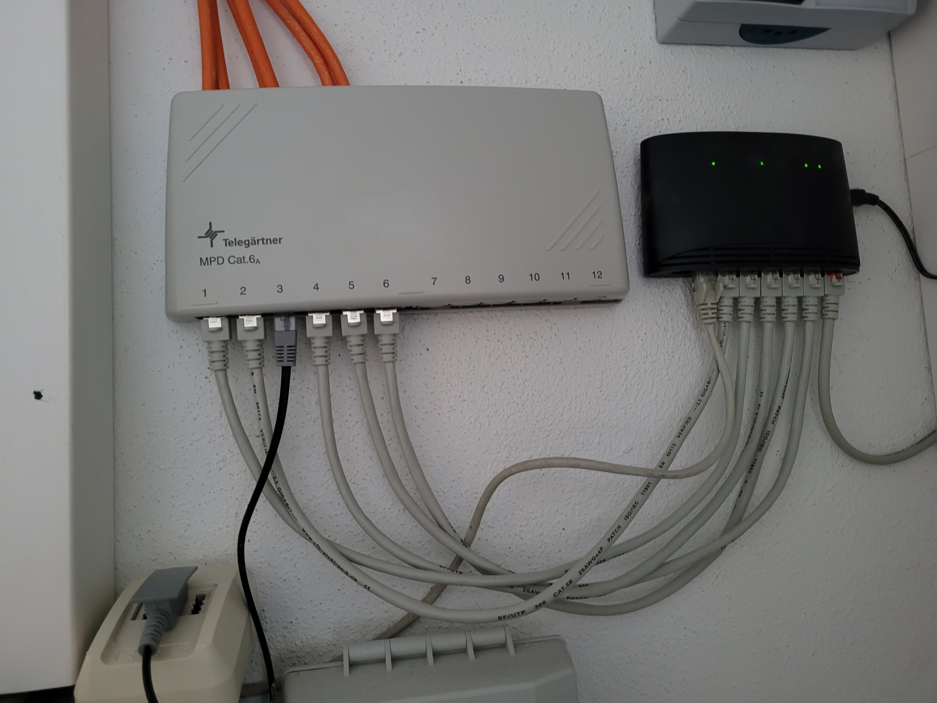 So dann verbinde mal die übrigen 7ports vom switch mit den übrigen Ports des Telegärtner Patchpanel. Dann alle übrigen Dosen in den Zimmern testen.