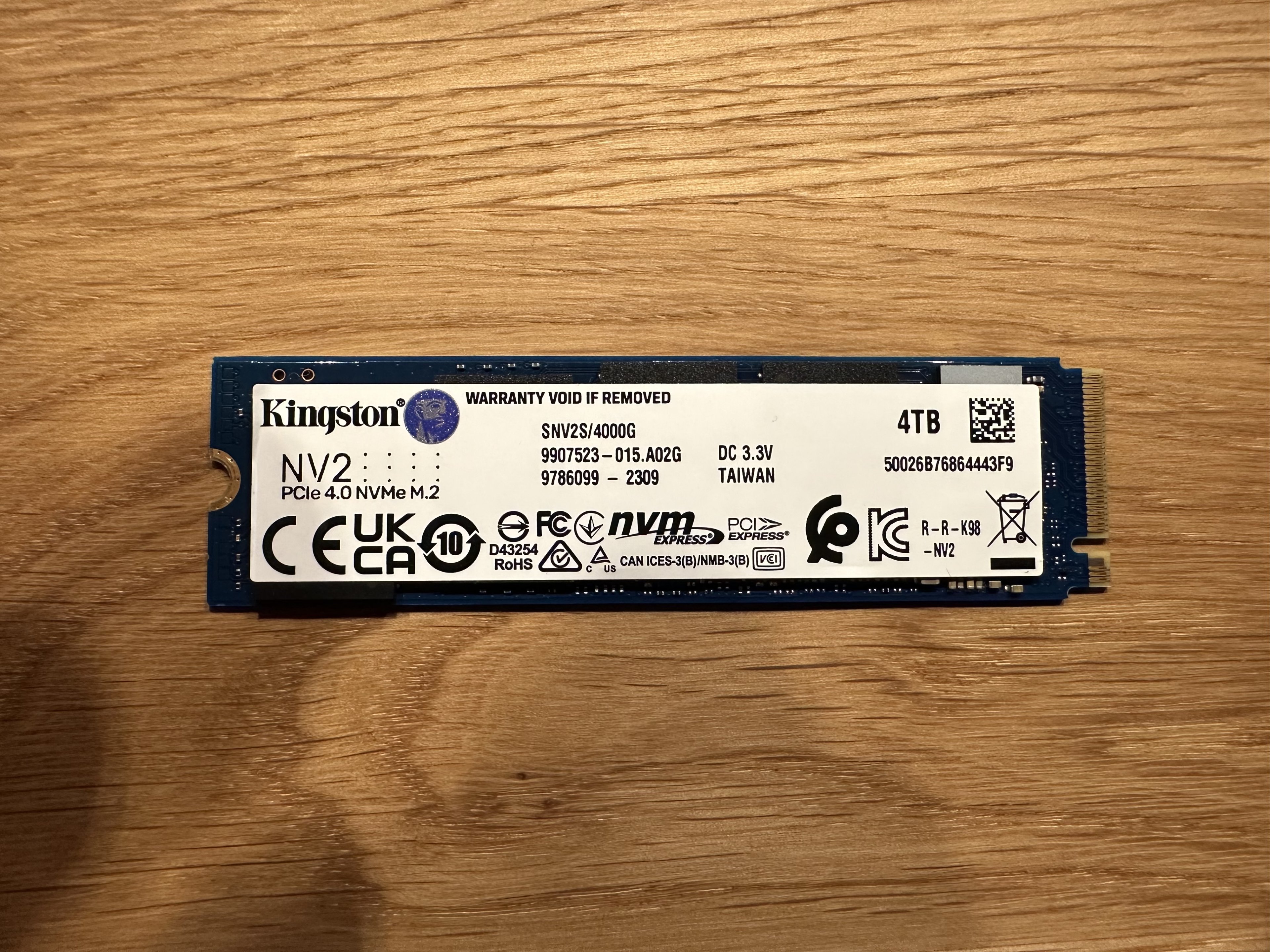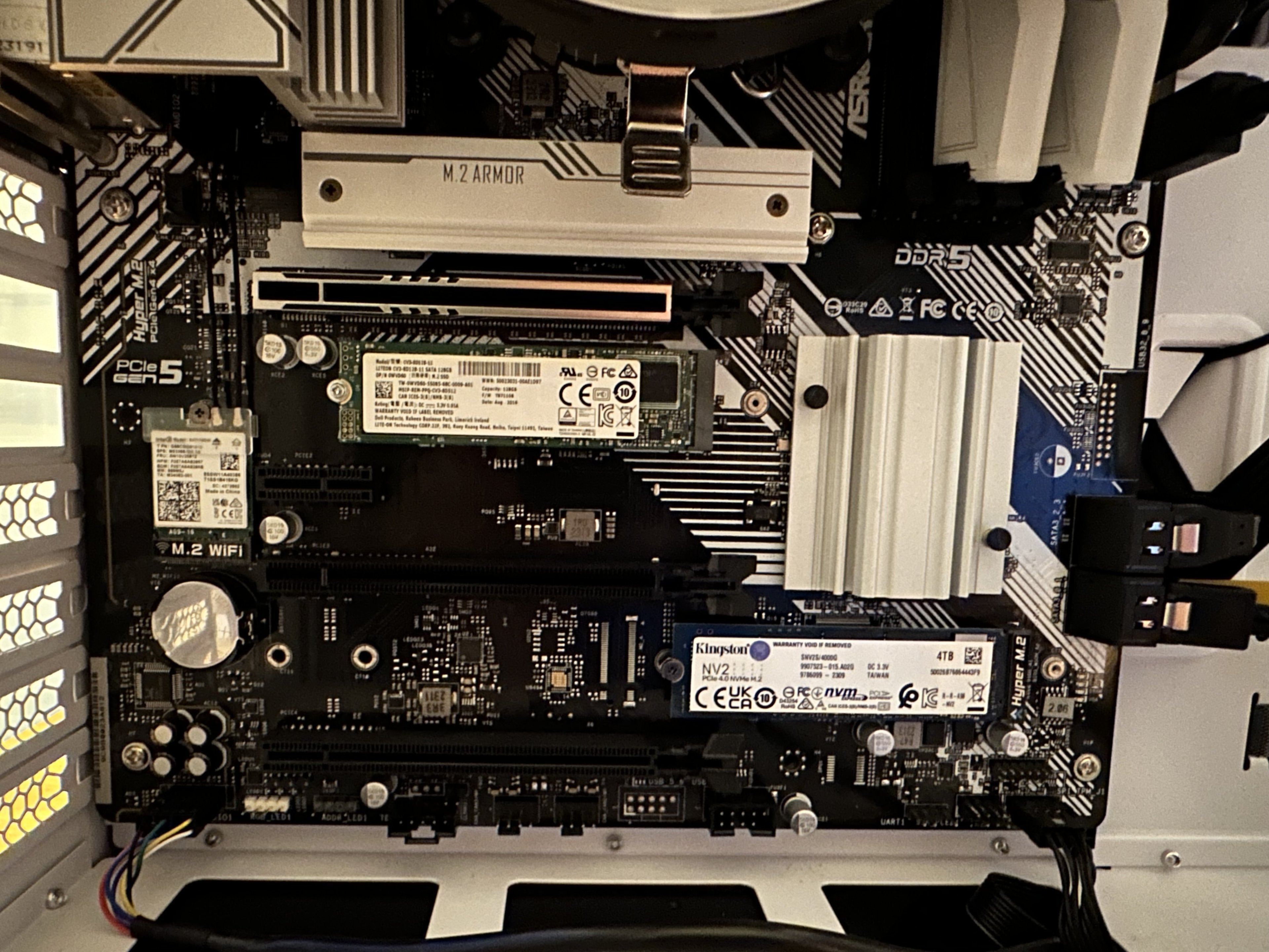 Später habe ich noch in einen anderen Slot, einem M2 PCIe Gen4 x4 (Hyper Socket) eine Kingston NV2 NVMe mit 4 TB eingesetzt und diese funktioniert auf ähnliche weise nicht. Was zusätzlich hinzugekommen ist, dass der Boot des Rechners länger dauert, und über eine längere Zeit, vor dem ASRock Boot Bildschirm einfach nur ein Unterstrich angezeigt wird, der aber auch nicht blinkt (Bild angehangen).