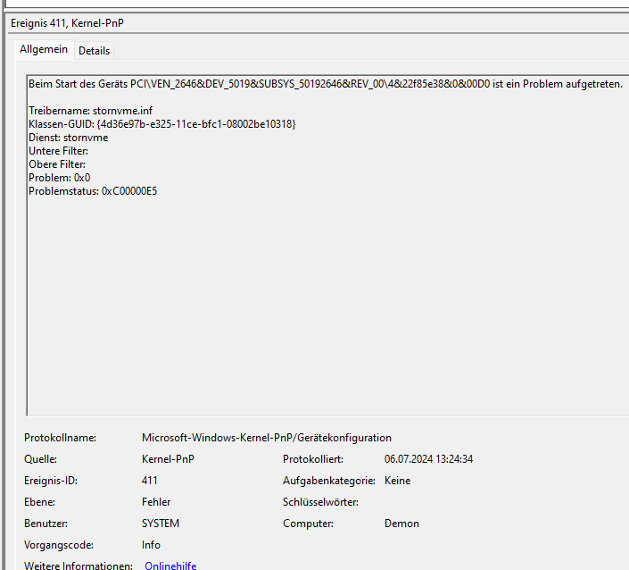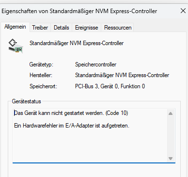 Ich habe im Geräte Manager einen Eintrag mit einem Ausrufezeichen gefunden, beim "Standardmäßiger NVM Express Controller". Screenshots sind angehängt. Leider habe ich nichts aufschlussreiches über die Fehler gefunden.