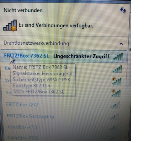 In dem Fenster unter den Drahtlosnetzwerkverbindungen hat meine Fritzbox einen eingeschränkten Internetzugriff.