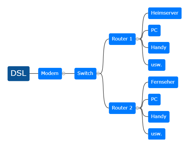 DSL geht in den ersten Router (Speedport Hybrid), ein LAN-Ausgang geht in einen 4-Port Switch, an welchem wiederum zwei Fritzboxen hängen