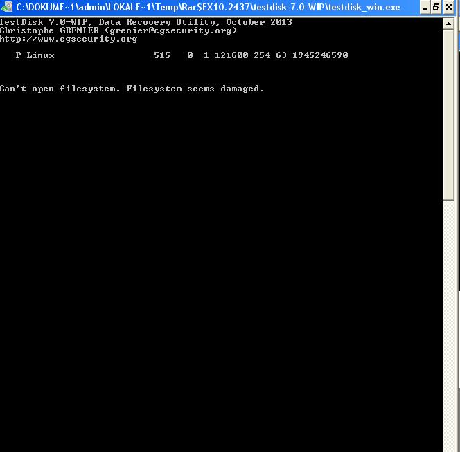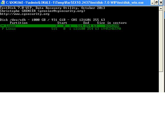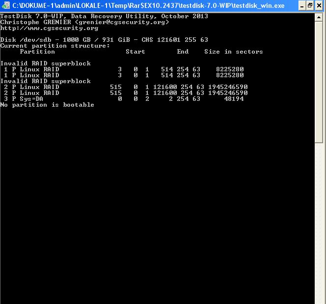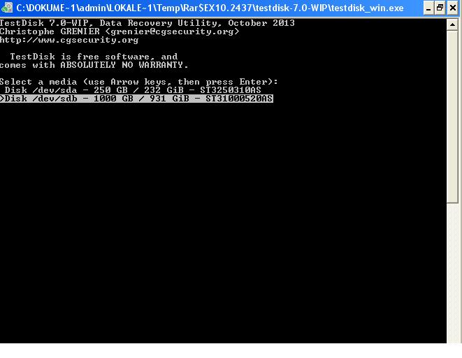 Mit Testdisk habe ich eine Analyse durchgeführt, leider ohne Erfolg. Es wurden keine Partitionen gefunden, ebenso mit dem deeper search.