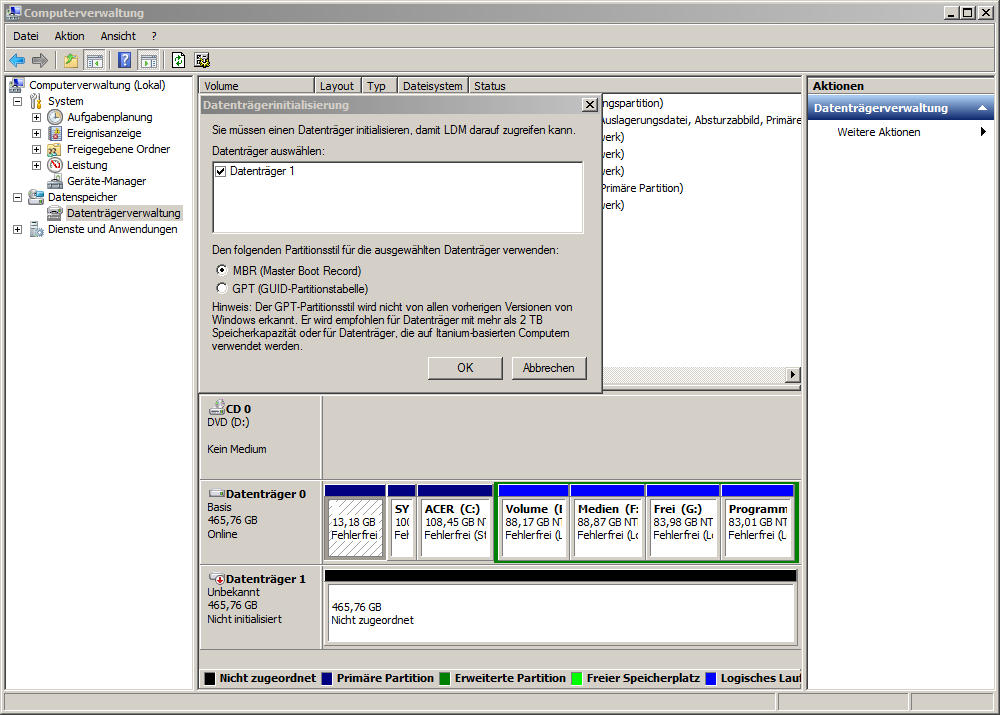 In der Datenträgerverwaltung erscheint sie als Datenträger 1, unbekannt, nicht initialisiert. Die Verwaltung möchte die Platte mit MBR oder GPT initialisieren. Habe keine Ahnung davon.