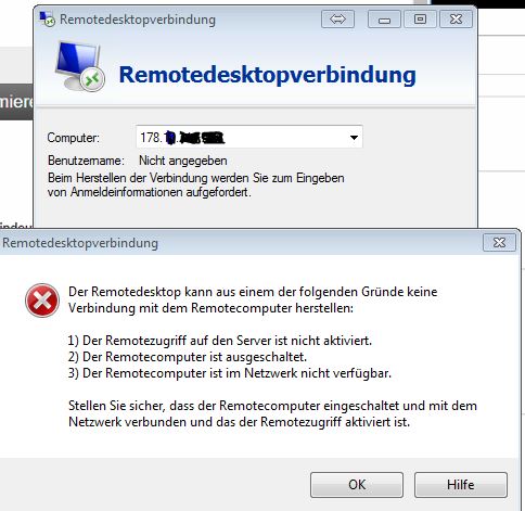 Wenn ich die Windows Remotedesktopverbindung in einem anderen Netzwerk öffne und meine extere IP-Adresse 178.XX.XXX.XXX eingebe, kommt nach ein paar Sekunden immer wieder der Fehler, dass keine Verbindung hergestellt werden könne, da entweder Remotezugriff nicht aktiviert, der PC ausgeschaltet oder nicht im Netzwerk verfügbar ist.