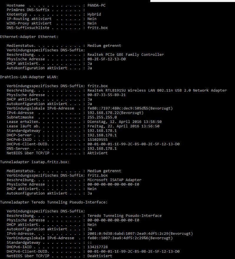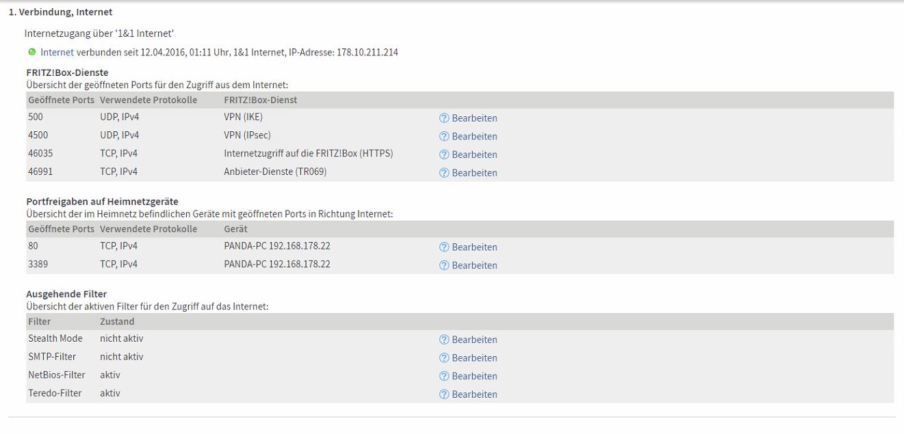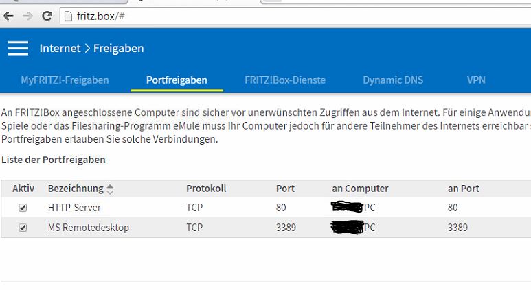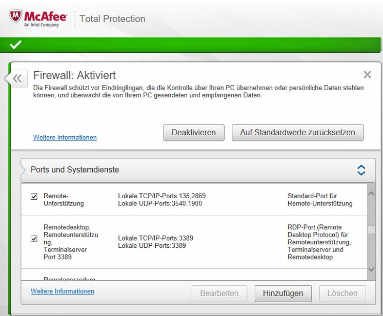 In der McAfee-Firewall wurde der Port 3389 schon standardmäßig freigegeben (Windows-Firewall ist ausgeschalten), ebenso wie in den Fritzbox-Einstellungen.