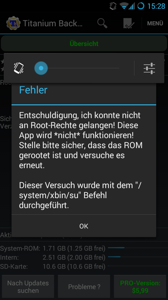 Nun aber zu meinem Problem: die Root-Rechte sind wieder weg. Super SU ist drauf und es sieht auch alles nach Root aus, aber Titanium Backup geht nicht, da das Gerät nicht gerootet ist.
