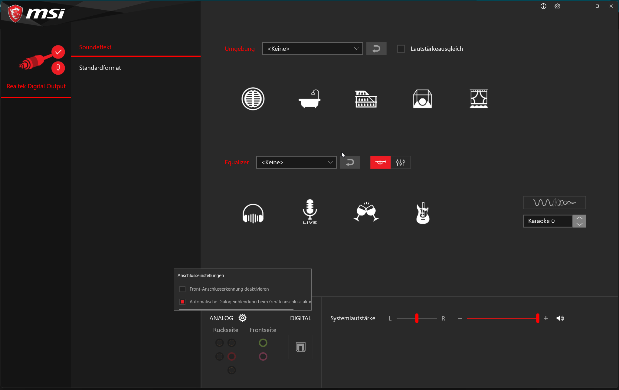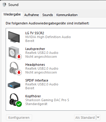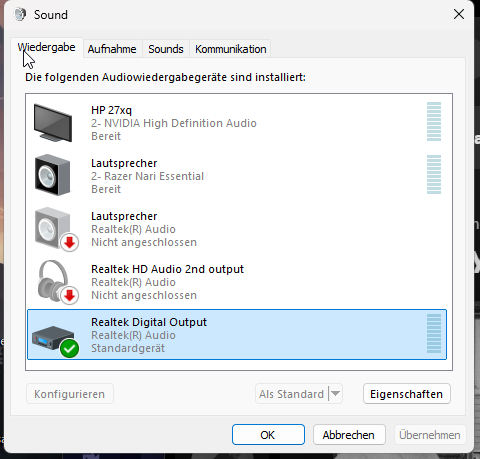 hallo leute ich brauch mal wieder eure hilfe. ich habe den vormittag damit verbracht das mainboard an meinem rechner zu wechseln. nach viel getue hab ich den rechner zum laufen bekommen, jedoch habe ich das problem, dass über meine lautsprecher kein sound mehr wiedergeben wird. im lautstärke mixer sind drei geräte zu sehen, mein headset, mein monitor und realtek digital output. mit dem alten mainboard war ein weiteres gerät dabei, welche meine lautsprecher waren. jetzt hab ich alles mit dem realtek digital output versucht zu fixen, sprich ständig neue treiber ausprobiert, aber ohne erfolg. ich hab leider kein 3,5mm klinkendevice um zu schauen ob es an den lautsprechern oder dem output des mainboard liegt. richtig eingesteckt sollte alles auch sein. wenn ich die klinke ins gehäuse/mainboard stecke, entsteht auch ein rauschendes geräusch, also strom überträgt sich wie üblich weiter.