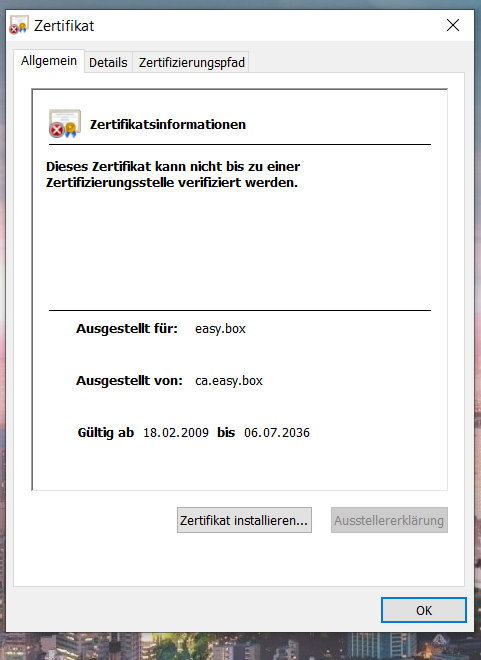 Nun lässt sich das Problem wahrscheinlich sehr einfach durch einen Klick auf "Zertifikat installieren..." beheben, da ich aber ein Laie bin und Vorsicht besser als Nachsicht ist, wollte ich hier erstmal nachfragen, ob das nicht eine gut getarnte Schadsoftware sein könnte.
