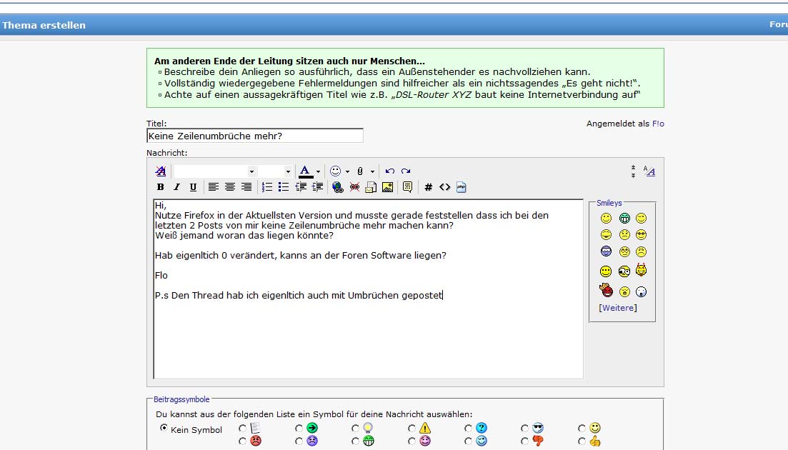Hi, Nutze Firefox in der Aktuellsten Version und musste gerade feststellen dass ich bei den letzten 2 Posts von mir keine Zeilenumbrüche mehr machen kann? Weiß jemand woran das liegen könnte? Hab eigenltich 0 verändert, kanns an der Foren Software liegen? Flo P.s Den Thread hab ich eigenltich auch mit Umbrüchen gepostet