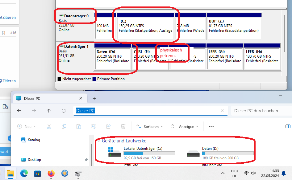 Meine zweite Idee war es, die Windowsdaten auf d zu legen und von dort zu booten. Da wurde mir davon abgeraten.