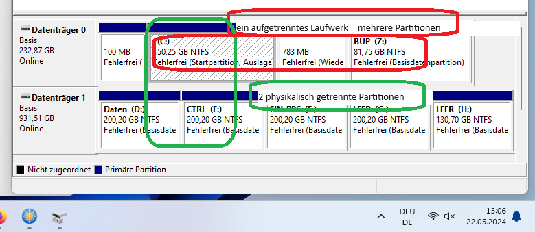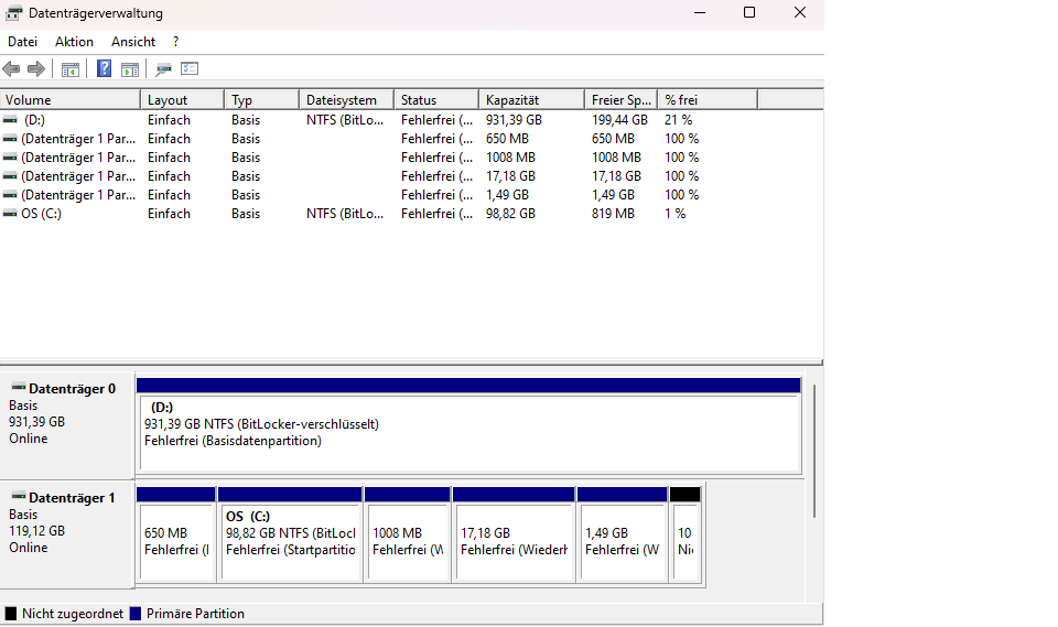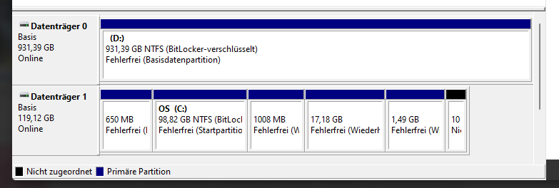Donnidonis schrieb:Öffne mal die Datenträger Verwaltung und zeig die Aufteilung der Partitionen (Rechtsklick auf Windows Symbol -> Datenträger Verwaltung)