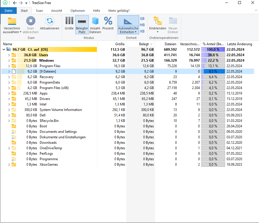 Wenn du in TreeSize nicht genau ablesen kannst, was die Daten frisst, kannst du auch gern ein Screenshot davon posten.Nilson schrieb:1. Mit der Windows Datenträgerbereinigung (als Admin ausführen) mal aufräumen. Das schafft meist etwas Luft. Ggf. liegt bei dir noch ein Windows.old vom letzten update rum