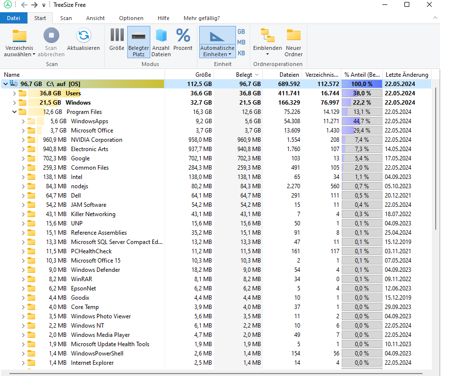 2. Mit TreeSize (als Admin ausführen) prüfen, was da den Platz frisst. Dann gezielt anpassen (liegt z.B. Steam auf C;, frisst die hibbernate.sys 16 GB etc.)