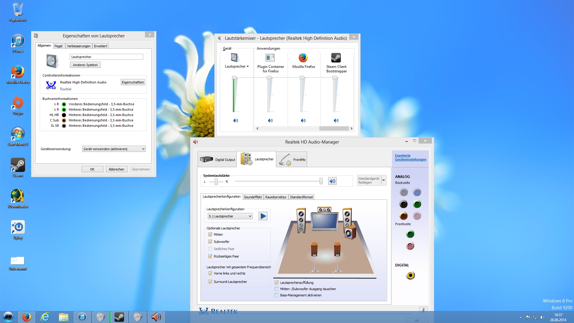 Die Lautsprecher funktionieren (5.1 Anlage von Teufel) auch jeder einzelne Anschluss funktioniert. Wenn ich ein Lied starte in iTunes wird mir zwar rechts unten bei dem Lautsprechersymbol angezeigt, dass der Sound da ist, weil dieser grüne Balken rauf und runter geht, also funktioniert das auch, jedoch erhalte ich keinen Ton. So als würde ein Ton abgegeben werden, jedoch keiner aus den Lautsprechern kommt.
