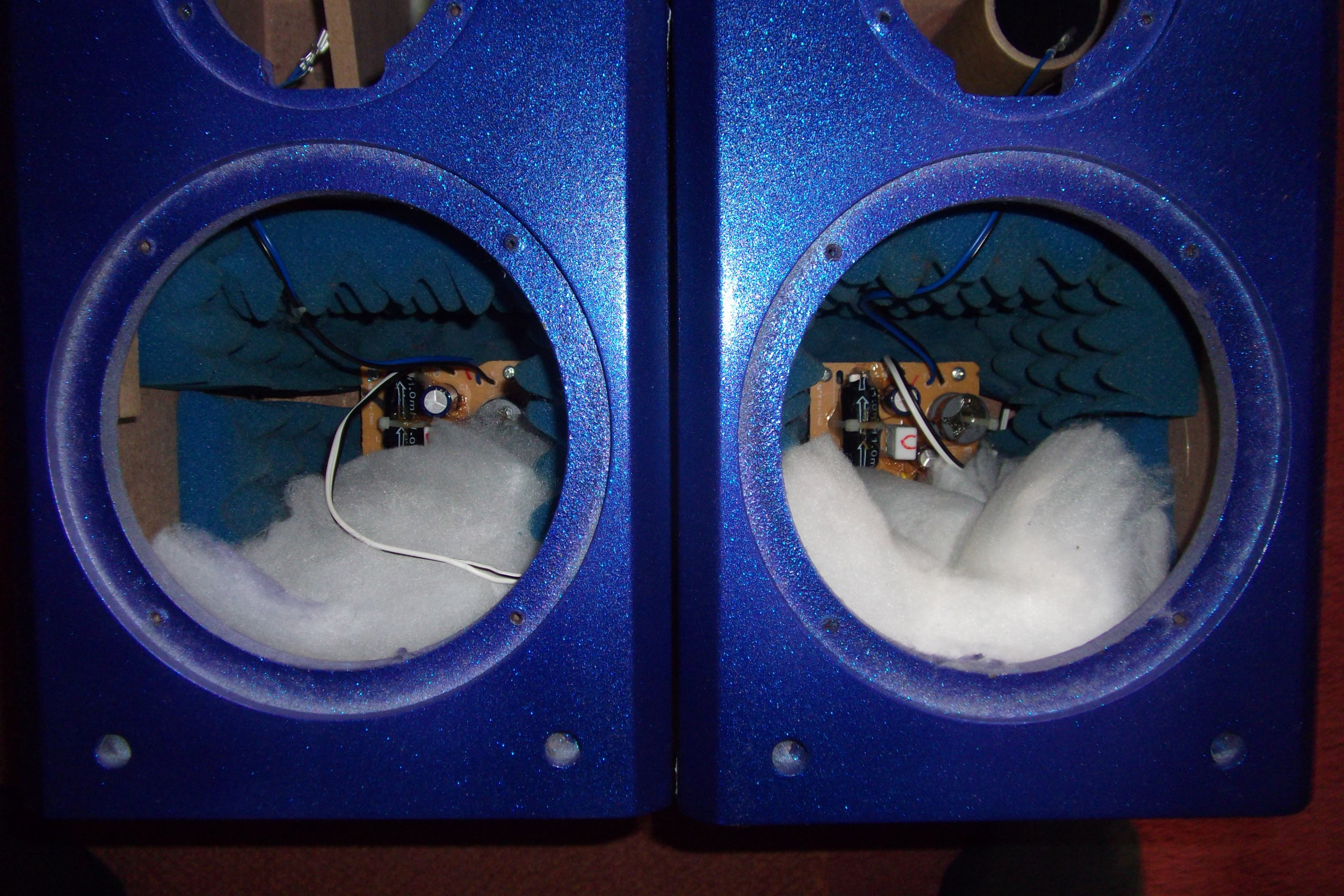 Die Lautsprecher sind auch wirklich gut als Monitore mit geringem Sitzabstand geeignet. Sie haben auch richtige Weichen und nicht nur einen Kondensator für den Hochtöner. Den Akusikschaumstoff hatte ich auch schon, dewegen musste der auch noch rein.