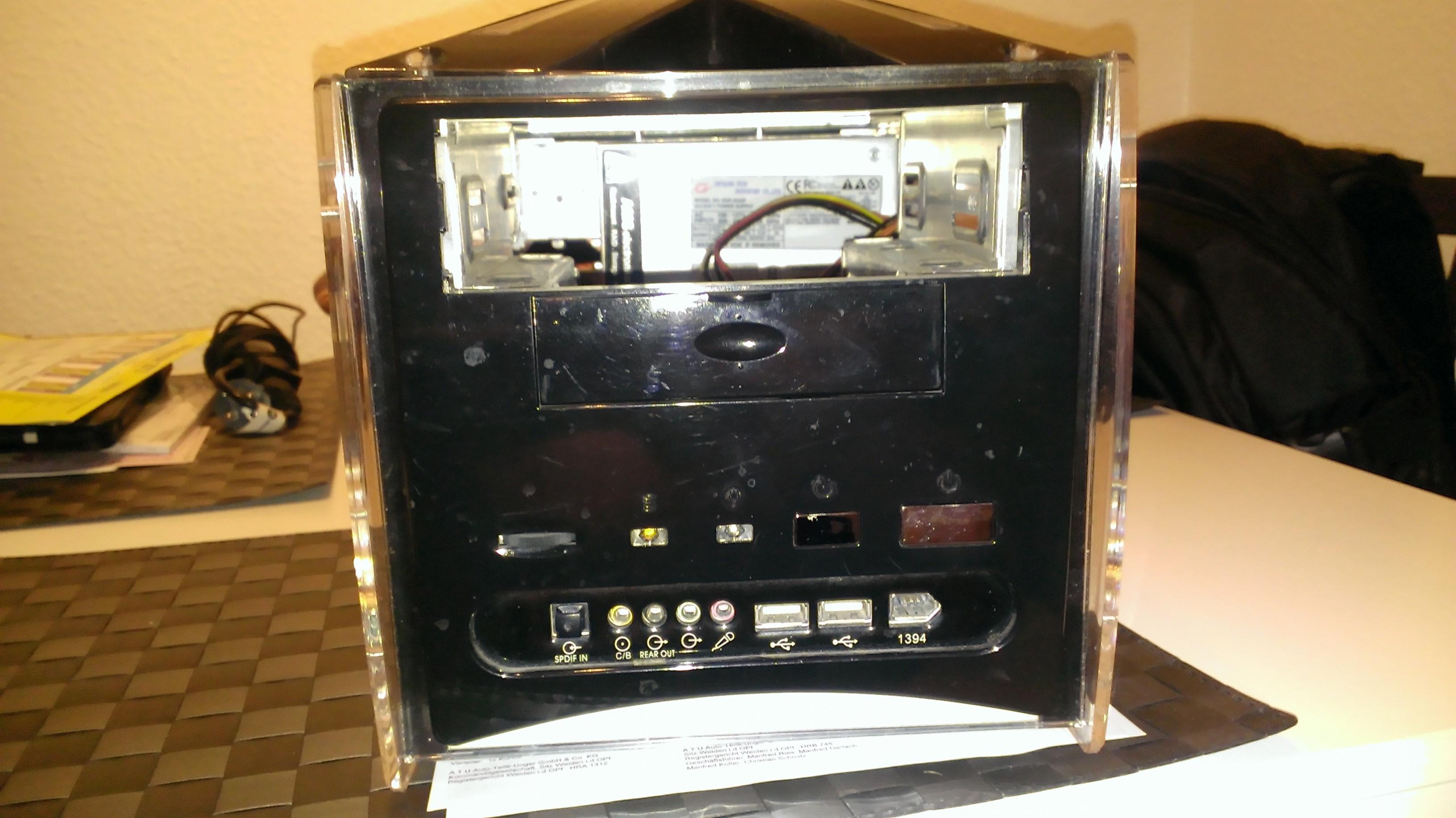 Es ist in einem erbärmlichen Zustand aber ich denke mit ein bißchen Arbeit (und da mir die Optik gut gefällt) kriegt man einen netten HTPC draus. Dummerweise finde ich nichts an oder in dem Teil was auf Hersteller oder geschweige denn Modell hinweist. Ohne Specs ist allerdings schwierig passende neue Hardware für das gute Stück zu suchen und wenn ich irgendwo für Ersatzteile anfragen könnte (Frontpanel ist hinüber) wäre das auch hilfreich