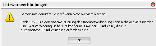 Hättest du dir mal genau die Beschreibung zu ICS durchgelesen, wüsstest du warum diese Fehlermeldung kommt(steht ausserdem doch auch dort in der Fehlerbeschreibung da). ICS vergibt der Netzwerkkarte, die zum LAN geht, automatisch die IP Adresse 192.168.0.1 . Hat eine andere Netzwerkkarte(oder diesselbe) diese IP schon, kann es auch nicht funktionieren. Stell bei der einen Netzwerkkarte, die geändert werden soll, vorher "IP automatisch beziehen" ein, oder ändere eventuell diejenige Netzwerkkarte, die bereits die IP ..0.1 hat, in eine andere Adresse um.