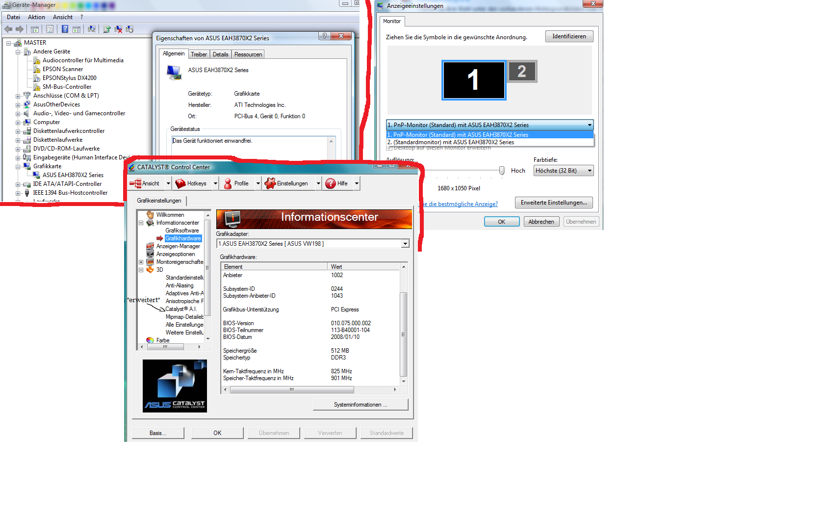 Ich habe ein großes Problem mit meiner ASUS EAH 3870 X2. (mein restliches System: http://www.sysprofile.de/id30715) Ich hab irgendwie dass Gefühl dass ein Kern auf meiner Karte kaputt ist bzw. nicht arbeitet. In meinem Anhang sind einige Screenshots damit ihr euch ein kleines bild machen könnt. Wisst ihr wie ich den 2. Kern zum laufen bekomm? oder glaubt ihr dass er kaputt ist? denn wenn ich ATI overdrive starte, dann steht da: "gesamte gpu's im test: "1" "