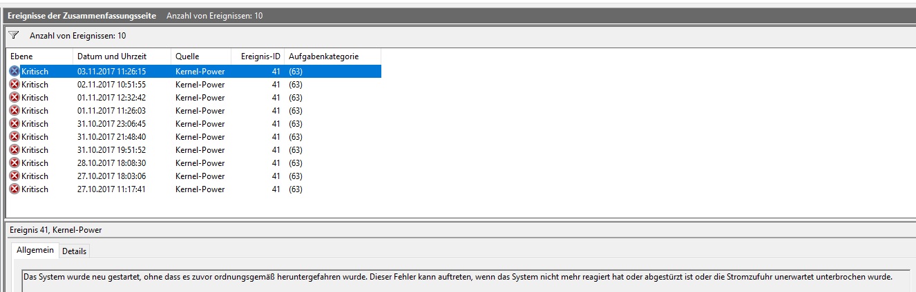 Da ich so langsam keine Idee mehr habe, wo der Fehler liegen könnte, würde ich gerne die in der Vergangenheit positiv erscheinende Schwarmintelligenz der Nutzer hier um Rat bitten. Denn es gibt im Internet zum Kernel-Fehler 41 zumeist eine Antwort: defektes Netzteil.