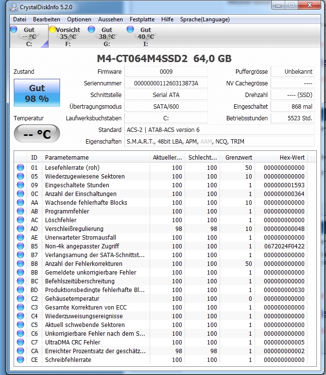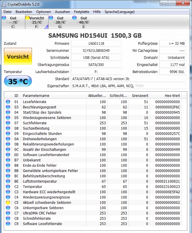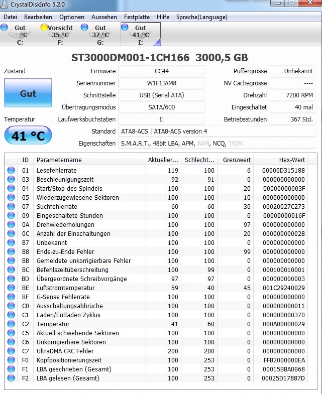 CrystalDiskInfo meldet bei einer Platte (extern) "Vorsicht", Bluescreens gibt es allerdings auch, ohne dass eine externe angeschlossen ist.