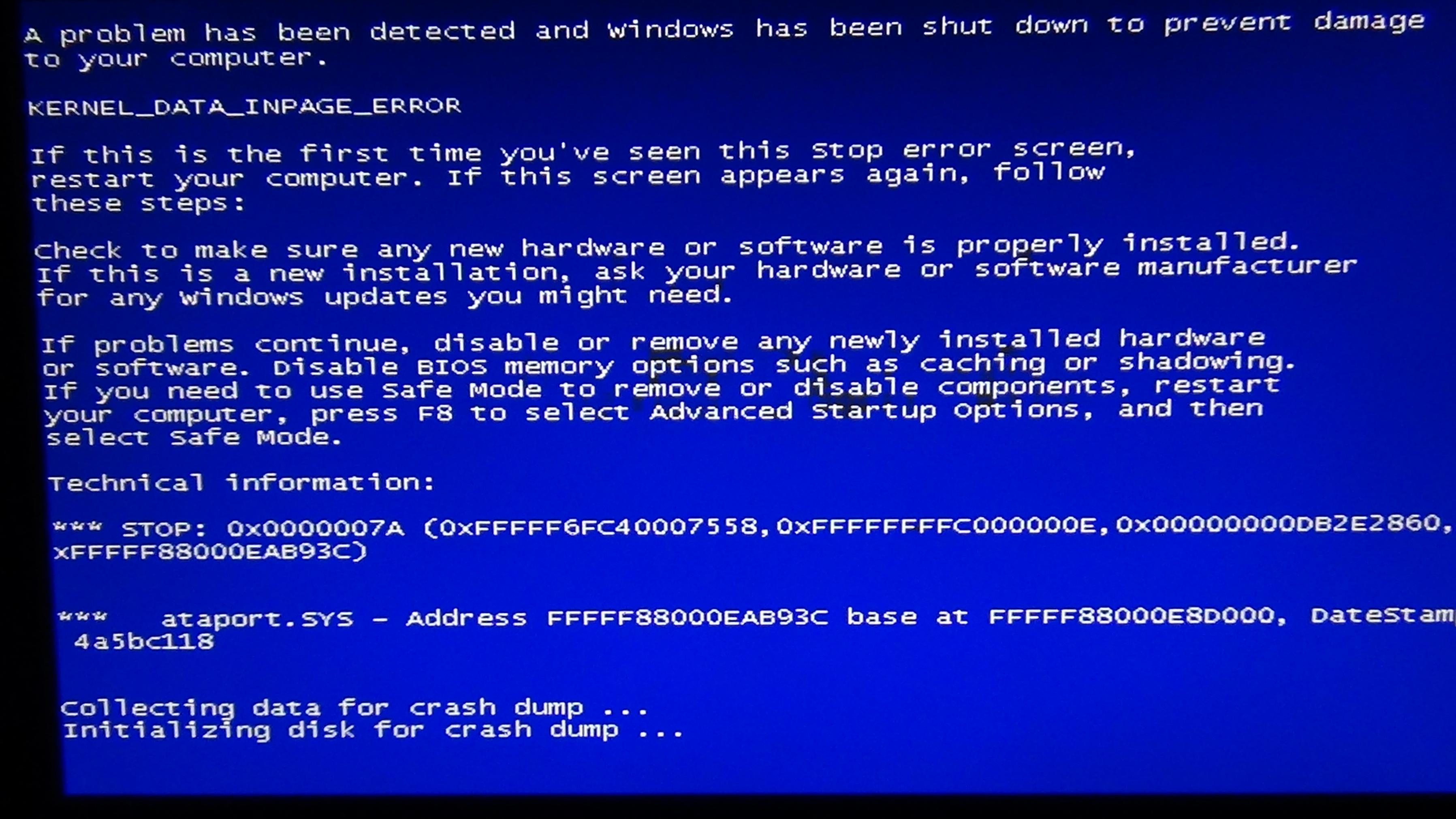 Das (Haupt-)Problem: Seit einigen Tagen werde ich alle 15-60 min. von einem Bluescreen heimgesucht, der da heißt: KERNEL_DATA_INPAGE_ERROR (siehe Anhang 1, Anhang 2 zeigt einen weiteren Bluescreen von mir), mit STOP: 0x0000007A und ataport.sys, wobei letzteres wechselt. Aktuell bekomme ich meist ntfs.sys . Ein besonderes Muster kann ich nicht erkennen.
