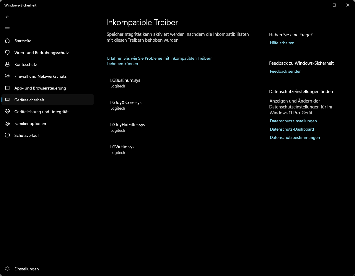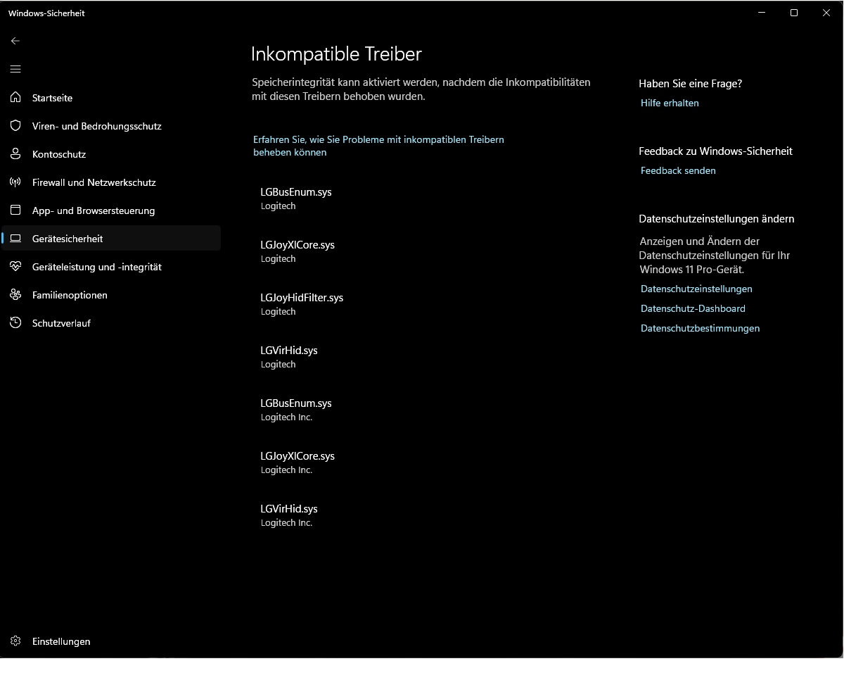 mein Win 11 meldete, dass die Speicherintegrität deaktiviert sei. Es anzustellen ging nicht, also schaute ich ein Video welches empfahl nach Treiberkonflikten zu schauen. Im Geräte Manager gab es in der Tat ein "Basisgerät" mit einem Ausrufezeichen. Als ich das googelte, landete ich bei einem Thread, bei dem der Poster das gleich Mainboard hatte. Also lud ich die Treiber und installierte sie. Das behob das Treiberproblem des Mainboards anscheinend. Allerdings lässt sich die Speicherintegrität immer noch nicht aktivieren. Wenn ich mir bei der "Kerinsolierung" die "inkompatiblen Treiber" anzeigen lassen, stehen dort Logitech Treiber. Ich benutze nur eine Logitech Maus. Die Software habe ich aktualisiert und den PC neugestartet. Das brachte keine Hilfe. Jetzt ist mein Latein am Ende. Im Gerätemanager läuft sonst alles fein.