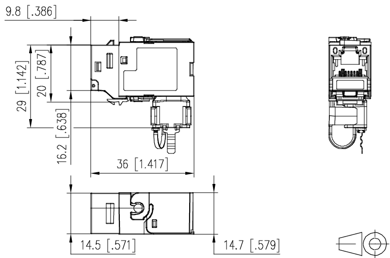 Über das DIGITUS CAT 6A Keystone Modul (Art Nr DN-93615) finde ich in der techn. Spezifikation, dass die Module eine Tiefe von 34,5mm haben. Die techn. Zeichnung ist widersprüchlich und sagt, dass die Tiefe des Moduls 36,21 ist. Über die dazu passende Anschlussdose (Art Nr DN-93801-1) gibt es auch kaum Maße. Technische Zeichnungen von der Dose mit Modul gibt es keine.