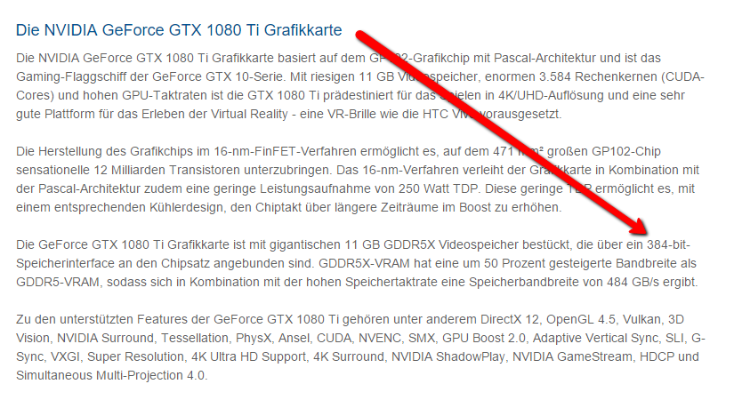 "Die GeForce GTX 1080 Ti Grafikkarte ist mit gigantischen 11 GB GDDR5X Videospeicher bestückt, die über ein 384-bit-Speicherinterface an den Chipsatz angebunden sind. GDDR5X-VRAM hat eine um 50 Prozent gesteigerte Bandbreite als GDDR5-VRAM, sodass sich in Kombination mit der hohen Speichertaktrate eine Speicherbandbreite von 484 GB/s ergibt."