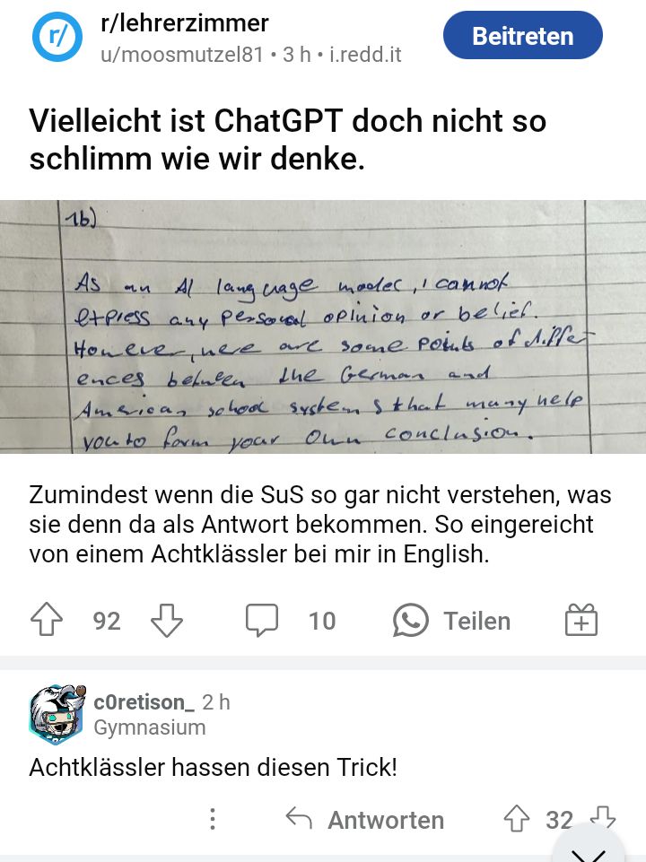 Und die Keule "Generell besteht das Risiko der Verbreitung von Falschinformationen und Propaganda." ist langsam abgenutzt. Das ist kein Risiko sondern Realität, denn ChatGPT ist erwiesenermassen Links ausgerichtet..