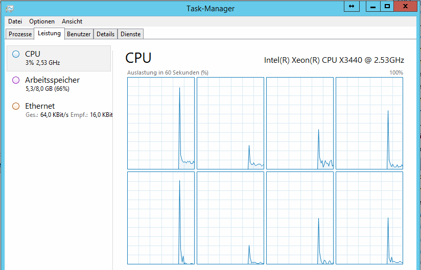 Schau dir mal die genaue Kernauslastung an, der Xeon ist ein Octacore, 12,5% wäre ein komplett ausgelasteter Kern.