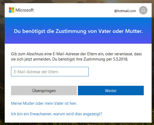 jetzt soll ich für meinen uralten hotmail- Login auf der outlook.com Seite Mutter oder Vater um Erlaubnis fragen oder Microsoft einen Altersnachweis zukommen lassen, falls ich doch ein Erwachsener wäre!