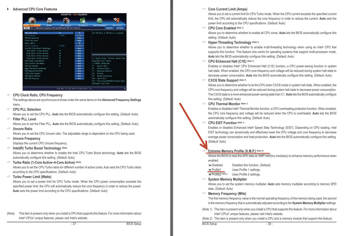 und dort ist dann nicht nur der Bereich 'Advanced Frequency Setting mit dem Unterbereich ' Advanced CPU Core Features' sondern darunter ein Bereich 'Advanced memory Setting'. Und dort der erste Eintrag müsste wie auf Seite 39 im Bild zu sehen, der mit dem XMP sein. Dort stellst du auf Enabled und dann müsste sich darunter eine neue zeile öffnen und wählst dort 'Profile1' aus.